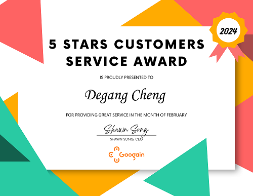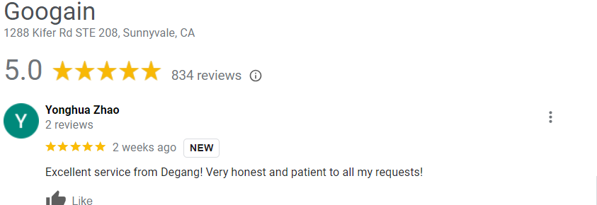 Googain之所以能在 Google Reviews上获得了超过 800 条全五星评价,是因为每一位客户的需求都得到我们整个团队的全力支持。我很荣幸成为 Googain 的一员,为客户提供满意的产品和快捷优质的服务。