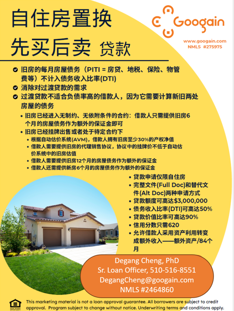 If your income isn’t sufficient to qualify for two mortgages during the transition period, the unique Buy Before You Sell program from Googain could be the perfect solution for you. This program excludes the mortgage on your current home from the debt-to-income ratio calculation, making it easier for you to qualify.