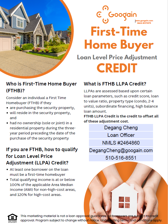 As a first-time homebuyer, you might worry about having an imperfect credit score, insufficient down payment, needing to purchase a condo, or applying for a large loan—factors that could affect your interest rate. But with our first-time homebuyer loan pricing adjustment credit, you can put those worries to rest. This credit can fully offset any price adjustments due to these factors, allowing you to secure a great interest rate even in the face of these challenges! Contact Degang Cheng to find out how we can make your first home purchase smooth and easy.