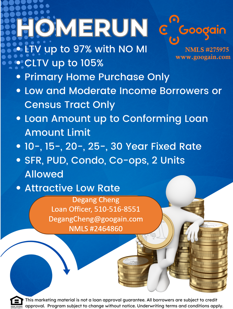 Googain HomeRun is a community reinvestment program that offers a below-market interest rate—comparable to or even lower than FHA loans—and currently about 0.7% lower than the national average for a 30-year fixed-rate mortgage reported by Mortgage News Daily.
