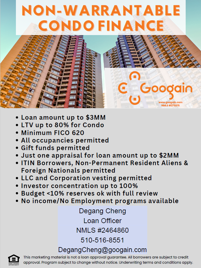 At Googain, we understand the unique challenges of financing non-warrantable condos. Our program is designed to offer the flexibility and support you need to navigate these challenges and achieve your homeownership or investment goals.